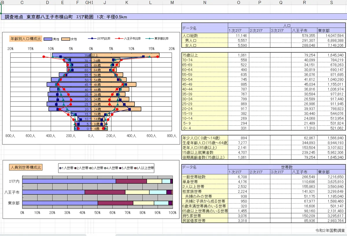 JSTAT商圏データ(桑並木通り×南小路交差点中心、半径0.5km)から浮かび上がる東町の人口特性を詳しく見ていきましょう。